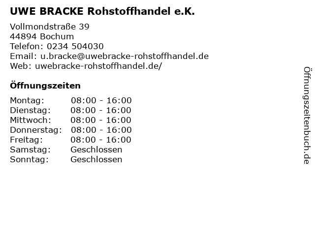| Öffnungszeiten UWE BRACKE Rohstoffhandel e.K. in Bochum anzeigen | |