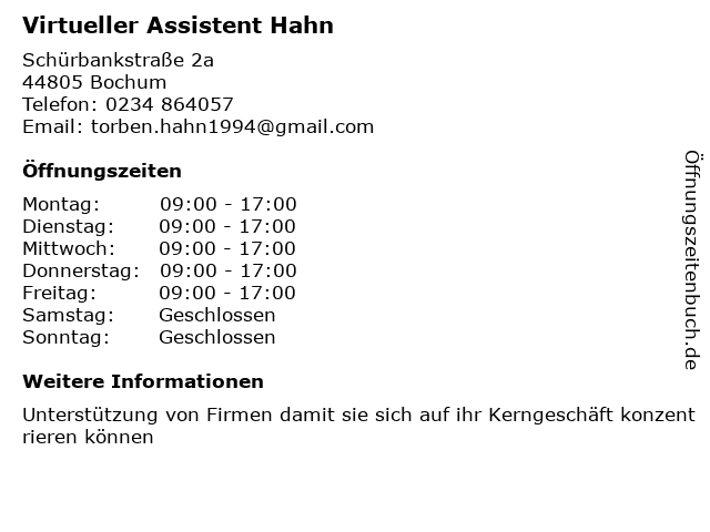 | Öffnungszeiten Virtueller Assistent Hahn in Bochum anzeigen | |