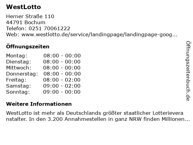 | Öffnungszeiten WestLotto in Bochum anzeigen | |