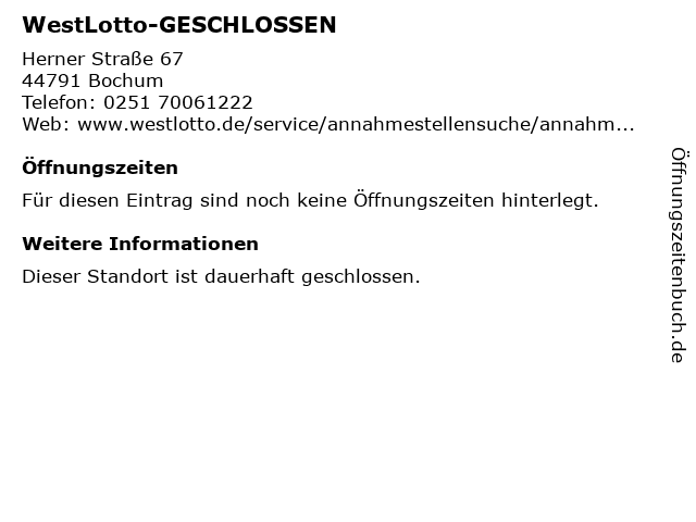 WestLotto-GESCHLOSSEN in Bochum: Telefonnummer, Öffnungszeiten und Adresse