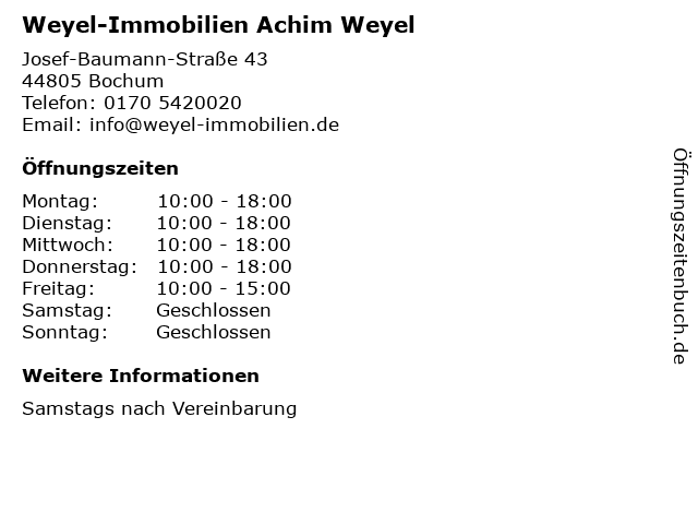 | Öffnungszeiten Weyel-Immobilien Achim Weyel in Bochum anzeigen | |