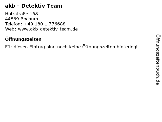 | Öffnungszeiten akb - Detektiv Team in Bochum anzeigen | |