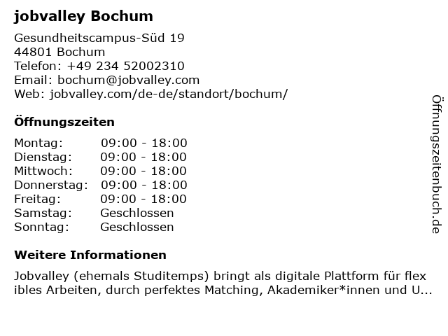| Öffnungszeiten jobvalley Bochum in Bochum anzeigen | |