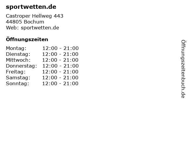 | Öffnungszeiten sportwetten.de in Bochum anzeigen | |