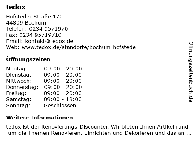 | Öffnungszeiten tedox in Bochum anzeigen | |