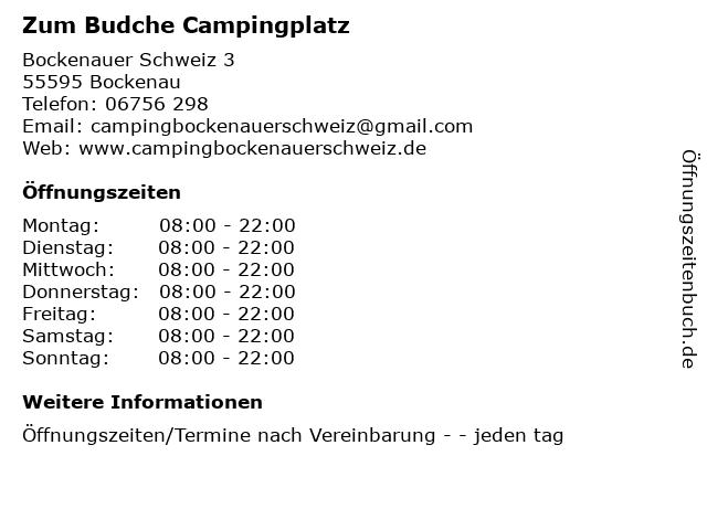 | Öffnungszeiten Zum Budche Campingplatz in Bockenau anzeigen | |