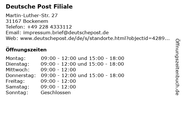 Öffnungszeiten Deutsche Post Filiale in Bockenem anzeigen | |