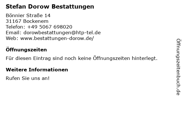 | Telefonnummer Stefan Dorow Bestattungen in Bockenem (+49 5067 698020) anrufen | |