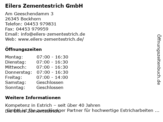 | Öffnungszeiten Eilers Zementestrich GmbH in Bockhorn anzeigen | |