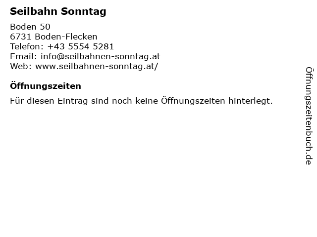 | Öffnungszeiten Seilbahn Sonntag in Boden-Flecken anzeigen | |