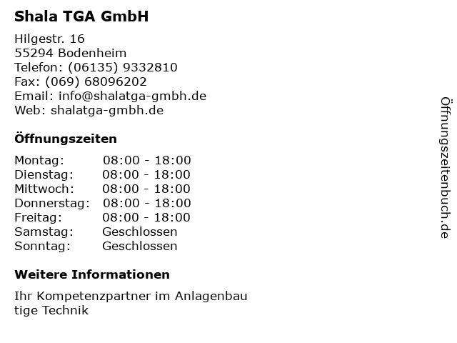 | Öffnungszeiten Shala TGA GmbH in Bodenheim anzeigen | |