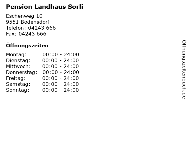 | Öffnungszeiten Pension Landhaus Sorli in Bodensdorf anzeigen | |