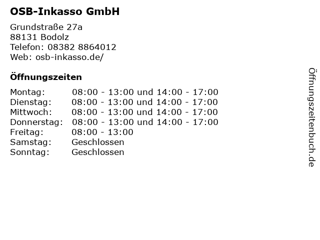 | Öffnungszeiten OSB-Inkasso GmbH in Bodolz anzeigen | |