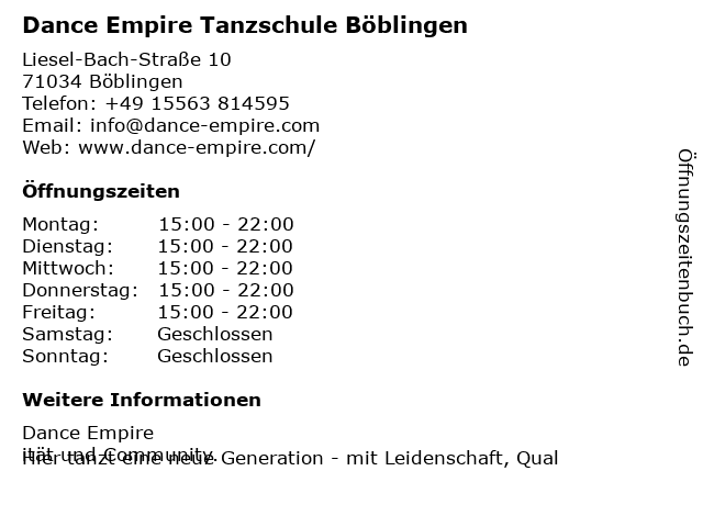 2 Tanzschule Bode, Thorsten Bode & Anke Bode-Pickenhahn GbR (Entfernung: 0,52 km) Bahnhofstr. 15, 71034 Böblingen 4 Stage Dance Ltg. Chana Spiridon Ballettschule (Entfernung: 2,38 km) Ziegelstr. 24, 71063 Sindelfingen 5 Tanzschule FABI DANCE ADTV-Tanzschule (Entfernung: 12,37 km) Karlsruher Str. 9, 70771 Leinfelden-Echterdingen 6 |