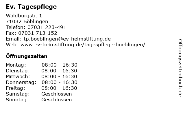 | Öffnungszeiten Ev. Tagespflege in Böblingen anzeigen | |