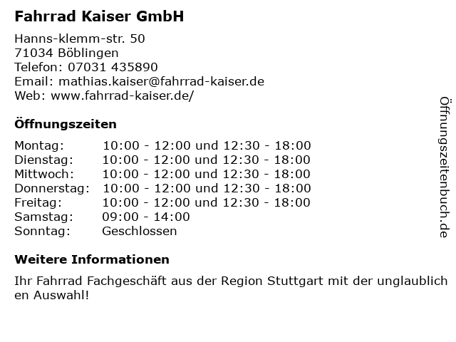 | Öffnungszeiten Fahrrad Kaiser GmbH in Böblingen anzeigen | |