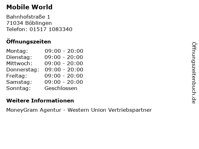| Öffnungszeiten Mobile World in Böblingen anzeigen | |