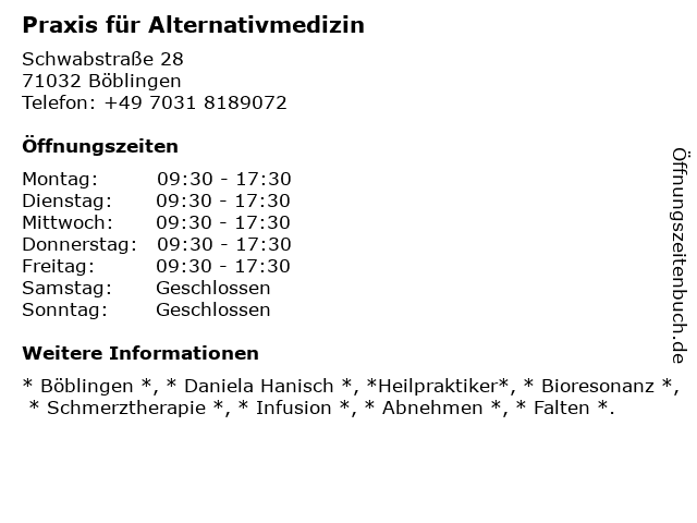 1 Dr. med. Bettina Lang - Privatpraxis für Alternativmedizin (Entfernung: 13,82 km) Marienplatz 4, 70178 Stuttgart 2 Praxis für Naturheilverfahren - Doris Engelmann (Entfernung: 1,62 km) Bebenhäuser Straße 36, 71034 Böblingen 3 Thomas Jäckel - Praxis für ganzheitliche Therapie & Naturheilkunde (Entfernung: 14,67 km) Rosenbergstr. 50/1, 70176 Stuttgart 6 Naturheilpraxis Heilpraktikerin Monika Ohnmacht (Entfernung: 33,17 km) Hohenzollernstr. 52, 75177 Pforzheim |
