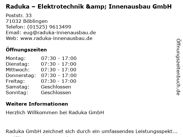 | Montag | 07:30-17:00 |