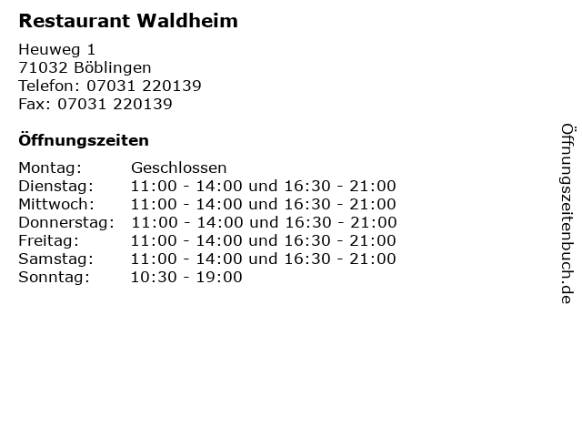 | Öffnungszeiten Restaurant Waldheim in Böblingen anzeigen | |