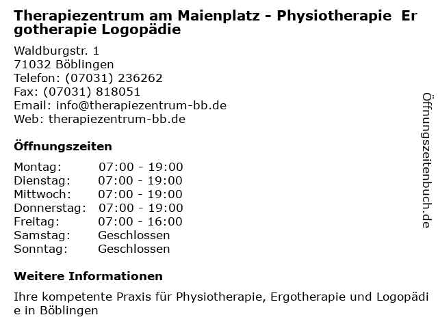 4 Ambulantes Therapiezentrum Sindelfingen Eva Starz (Entfernung: 1,53 km) Dresdner Str. 25, 71065 Sindelfingen 5 Ambulantes Therapiezentrum Inh. Eva Starz Ambulanter Dienst (Entfernung: 1,55 km) Dresdener Str. 25, 71065 Sindelfingen 6 |