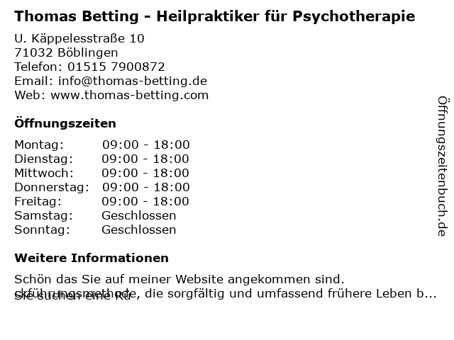 Branchen & Suchbegriffe zu Thomas Betting - Heilpraktiker für Psychotherapie:betting, heilpraktiker, psychotherapie, thomas |