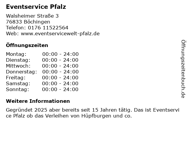 | Öffnungszeiten Eventservice Pfalz in Böchingen anzeigen | |