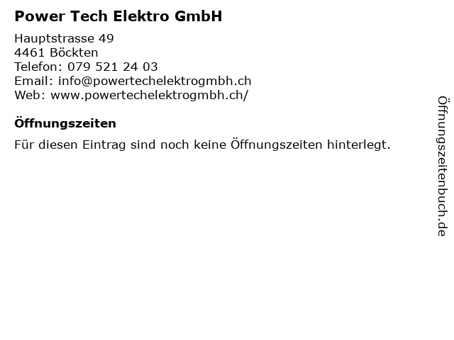 | Öffnungszeiten Power Tech Elektro GmbH in Böckten anzeigen | |