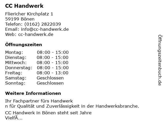 | Öffnungszeiten CC Handwerk in Bönen anzeigen | |