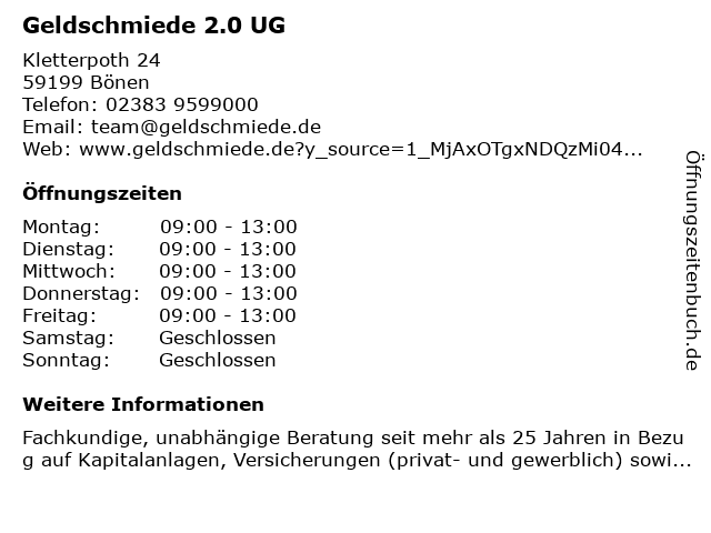 | Öffnungszeiten Geldschmiede 2.0 UG in Bönen anzeigen | |