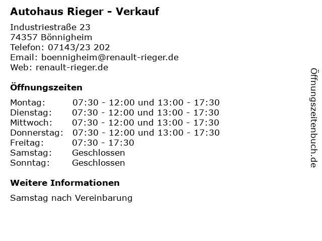 | Öffnungszeiten Autohaus Rieger - Verkauf in Bönnigheim anzeigen | |