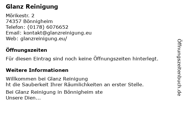 | Öffnungszeiten Glanz Reinigung in Bönnigheim anzeigen | |