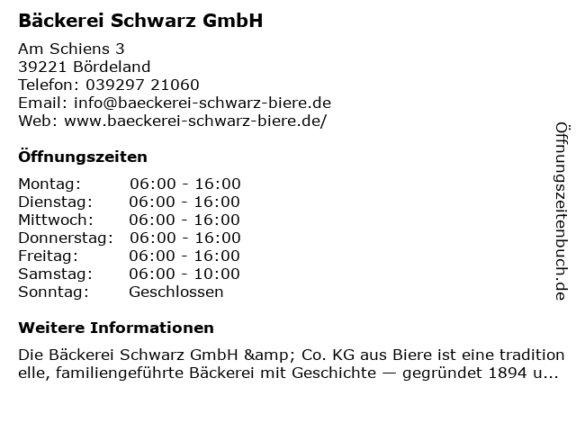 | Öffnungszeiten Bäckerei Schwarz GmbH in Bördeland anzeigen | |