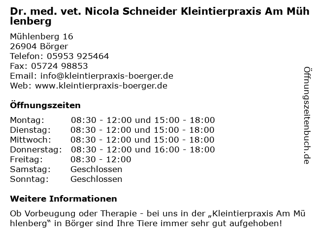 Branchen & Suchbegriffe zu Dr. med. vet. Nicola Schneider Kleintierpraxis Am Mühlenberg:dr., kleintierpraxis, med., mühlenberg, nicola, schneider, vet. |