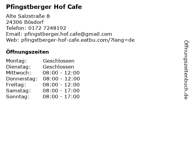 | Öffnungszeiten Pfingstberger Hof Cafe in Bösdorf anzeigen | |