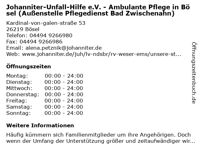 Branchen & Suchbegriffe zu Johanniter-Unfall-Hilfe e.V. - Ambulante Pflege in Bösel (Außenstelle Pflegedienst Bad Zwischenahn):ambulante, außenstelle, bad, bösel, e.v., gemeinnützige organisation, hilfe, hilfsorganisation, johanniter, pflege, pflegedienst, sozialarbeit, unfall, verband, wohlfahrtseinrichtung, zwischenahn |