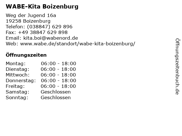 | Öffnungszeiten WABE-Kita Boizenburg in Boizenburg anzeigen | |