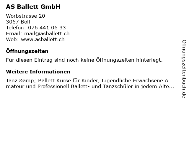 | Öffnungszeiten AS Ballett GmbH in Boll anzeigen | |