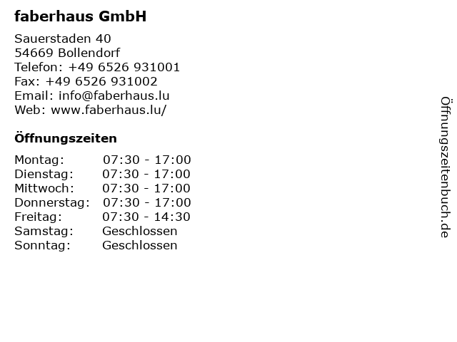 | Öffnungszeiten faberhaus GmbH in Bollendorf anzeigen | |
