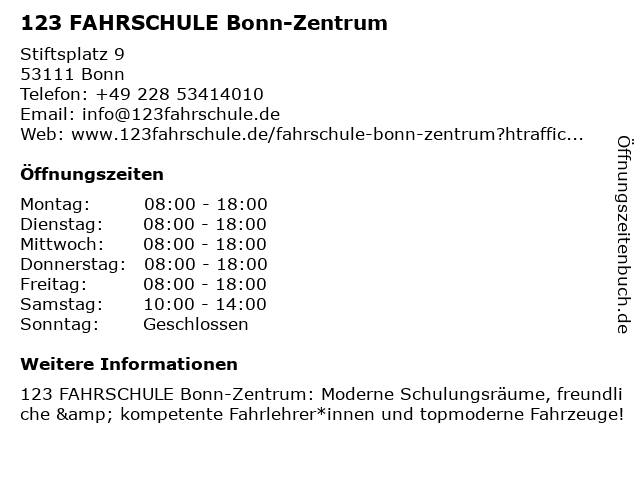 | Öffnungszeiten 123 FAHRSCHULE Bonn-Zentrum in Bonn anzeigen | |
