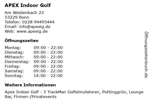 | Öffnungszeiten APEX Indoor Golf in Bonn anzeigen | |