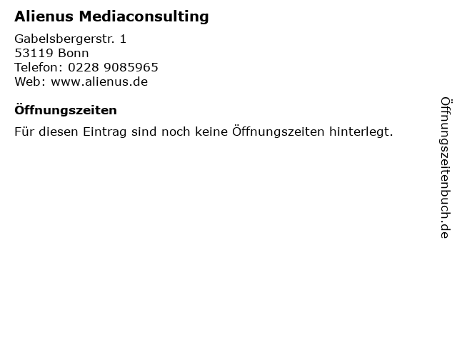 | Öffnungszeiten Alienus Mediaconsulting in Bonn anzeigen | |