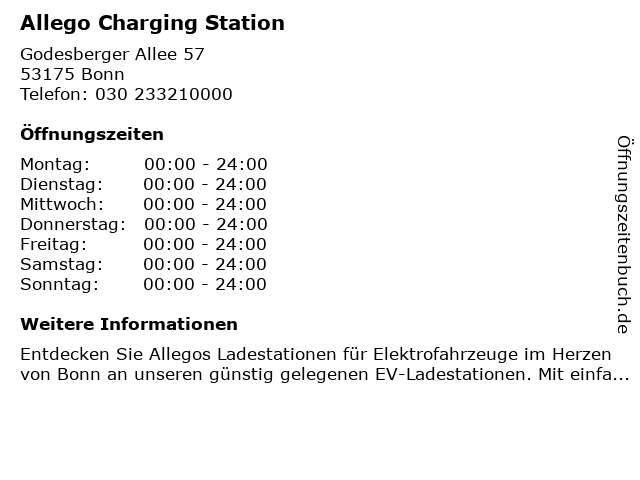 | Öffnungszeiten Allego Charging Station in Bonn anzeigen | |