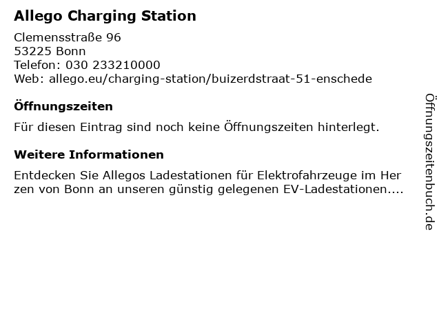 | Öffnungszeiten Allego Charging Station in Bonn anzeigen | |