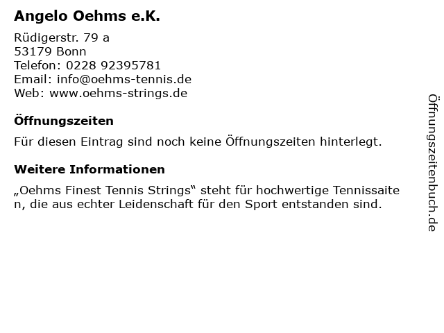 | Öffnungszeiten Angelo Oehms e.K. in Bonn anzeigen | |