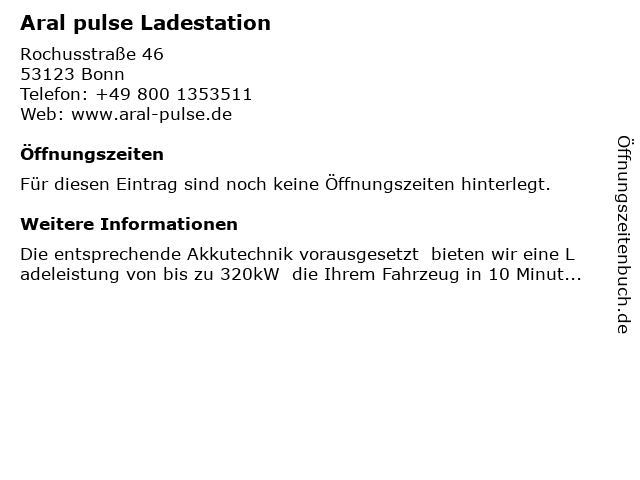 | Öffnungszeiten Aral pulse Ladestation in Bonn anzeigen | |