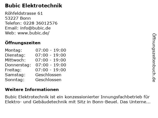 | Öffnungszeiten Bubic Elektrotechnik in Bonn anzeigen | |