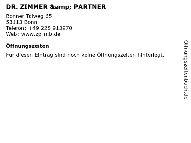 | Öffnungszeiten DR. ZIMMER & PARTNER in Bonn anzeigen | |