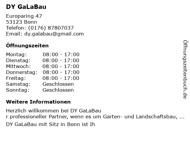 | Öffnungszeiten DY GaLaBau in Bonn anzeigen | |