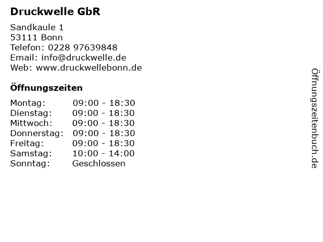 | Öffnungszeiten Druckwelle GbR in Bonn anzeigen | |